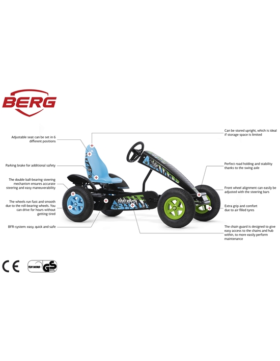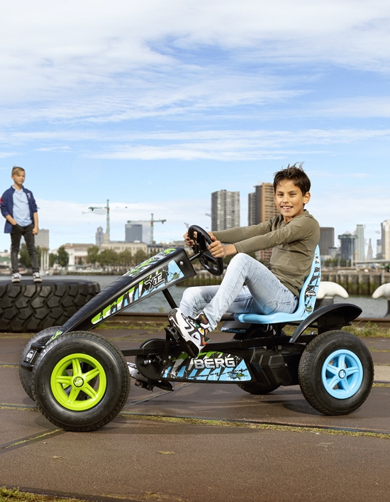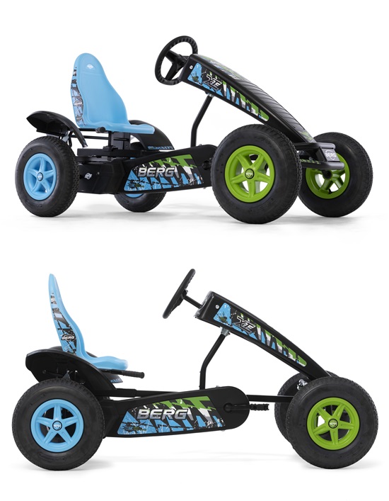 A BERG desenhou o BERG X-ite especialmente para entusiastas de carros a pedais arrojados. O grafismo foi inspirado no Moto Cross e conferem ao kart cores atrativas. Detalhes como super arrojados autocolantes no chassis completam o look deste fantástico kart a pedais.