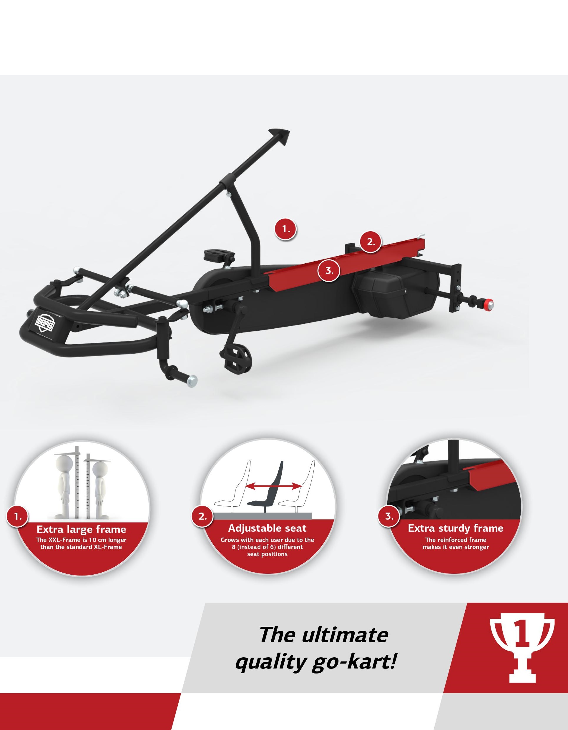 A versão XXL foi concebida para que as pessoas mais altas possam também desfrutar de um carro a pedais BERG. O chassis XXL tem 8 posições para o assento (2 posições a mais que a versão BFR) e é 10 cm mais longo. Agora ter 2 metros não é problema quando quiser pedalar um kart BERG.